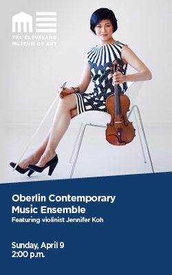 On Friday evening at 7:30 the Cleveland Museum of Art will host the Oberlin Contemporary Music Ensemble, conducted by Timothy Weiss, with Jennifer Koh, violin, Alexandra Armantrading, soprano, Rodrick Dixon, tenor, Timothy LeFebvre, baritone, and the Oberlin Percussion Group in Gartner Auditorium, 11150 East Blvd., Cleveland.