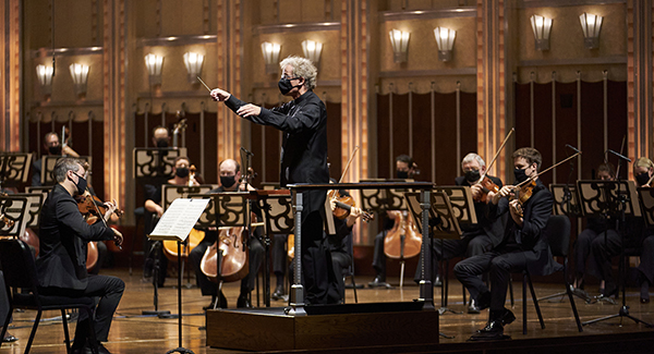 Pianist Yefim Bronfman, who sat for an informal interview before joining Franz Welser-Möst and the Orchestra for Alfred Schnittke’s Concerto for Piano and String Orchestra, noted that the pandemic gave him the opportunity to learn the 1979 work, which he described as a collage of styles masterfully put together. He said there was loneliness and darkness, but also an element of hope in the music.