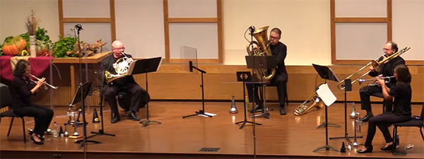 As a respite from those metaphorical conflagrations, the Quintet turned to cooler, contrapuntal stuff in an arrangement of J.S. Bach’s E-flat Organ Fugue, and paid tribute to Ewald, the 19th-century Russian civil engineer, cellist, and composer who more or less invented the brass quintet. The program and notes on the pieces were included in the video feed, and Amanda Bekeny, who is also a board member of the Society, served as emcee.